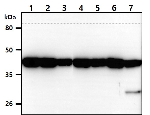 ![]() | The cell lysates (40ug) were resolved by SDS-PAGE, transferred to PVDF membrane and probed with anti-human ACTB antibody (1:1000). Proteins were visualized using a goat anti-mouse secondary antibody conjugated to HRP and an ECL detection system. Lane 1.: HeLa cell lysate Lane 2.: Jurkat cell lysate Lane 3.: PC3 cell lysate Lane 4.: HepG2 cell lysate Lane 5.: MCF7 cell lysate Lane 6.: U87-MG cell lysate Lane 7.: NIH-3T3 cell lysate |